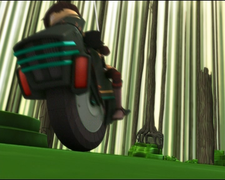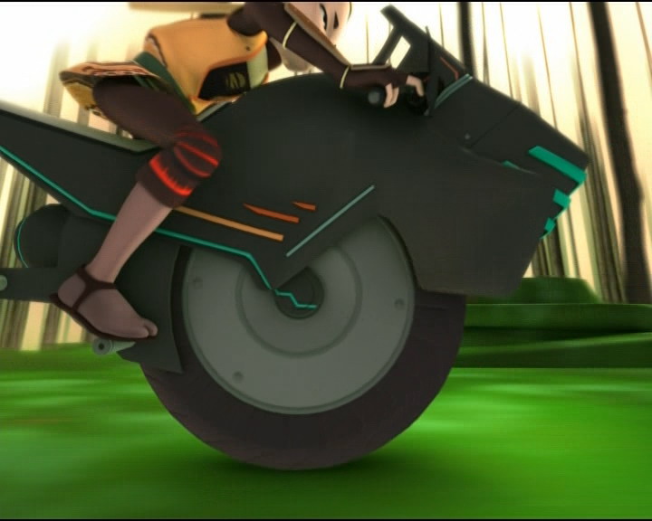 C'est une variante de moto, verte, qui n'a qu'une seule roue, un réacteur à l'arrière qui peut être activé par les poignées d'accélération, comme sur un de nos scooters... La selle est longue et élancée permettant d'accueillir un passager. Le fourreau de son sabre peut s'accrocher sur les côtés, lui offrant un accès rapide à l'arme ou lui permettant de la ranger lors des courses de véhicules à grande vitesse. |  | |